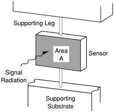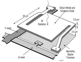| Individual sensor elements use the change in electrical resistance of a VOx resistor deposited onto the tiny “platelets” fabricated by silicon micro-machining in a silicon foundry. Incoming target radiation heats the VOx causing a change in electrical resistance, which is readout by measuring the resulting change in bias current. 80,000 and more sensors can be fabricated together into a two-dimensional array. The structure can be dimensioned to operate at 30 Hertz. That is, the thermal conductance of the isolating legs can be adjusted to match the time-constant for 30-hertz operation. An example of a microbolometer element is pictured below. | |